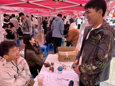 活动前,该社部门负责人完成场地布置与奖品摆放等准备工作。活动中,随着人流量增多,其摊位吸引众多同学。部门成员热情介绍社团活动内容与宗旨,引导同学们参与游戏和盖章活动。在三词造句游戏里,同学们积极应对难题,成功挑战后获得印章和抽奖机会,现场气氛热烈。成员们还不时抛出生物科学相关词语,在娱乐中向同学们传播知识。