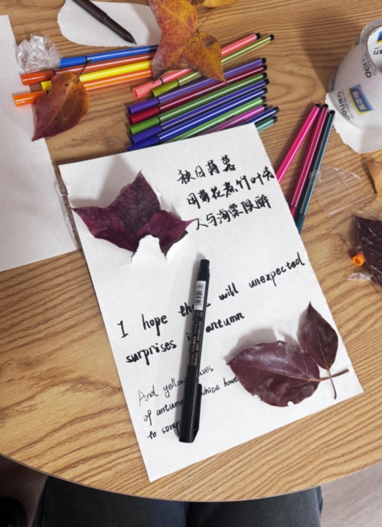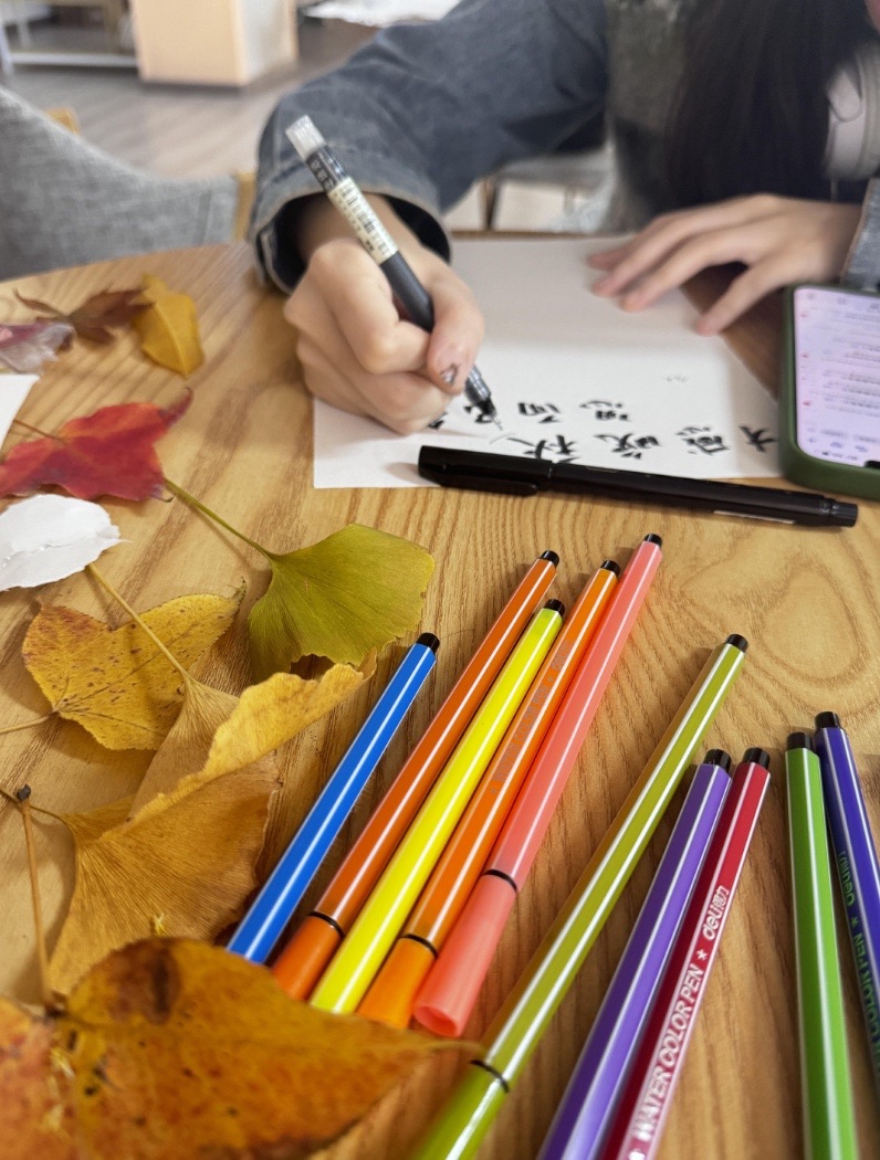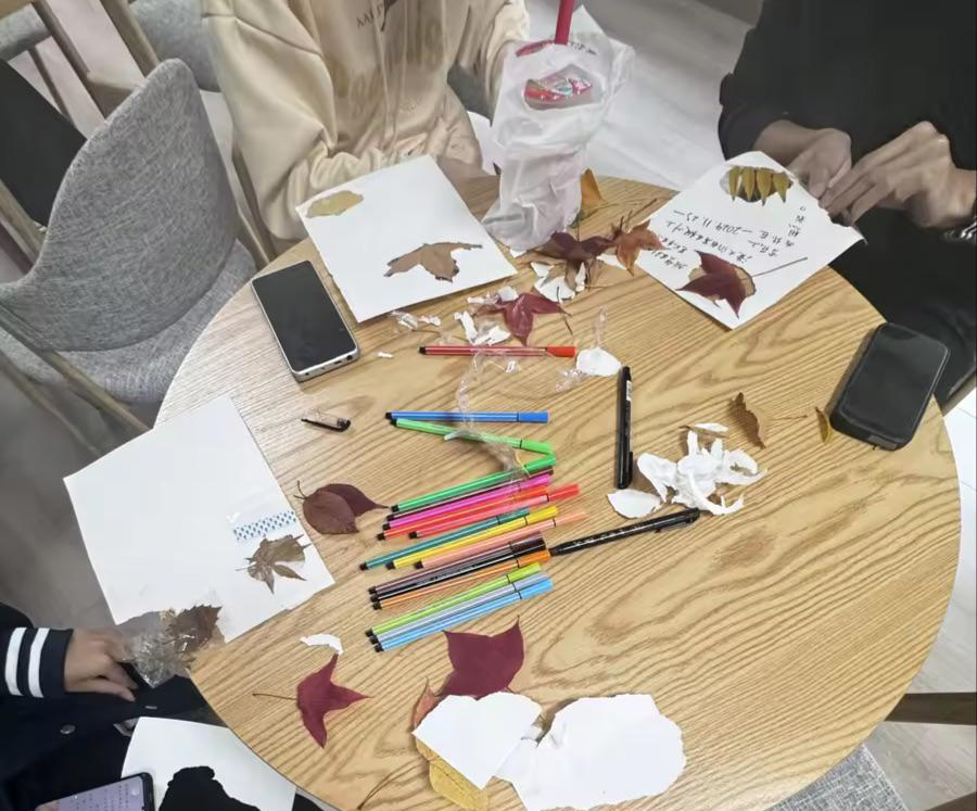本次活动以组建队列的形式展开活动,参加本次活动的社员们在带队学生的带领下走进秋天的校园,在秋意中找寻并搜集形状完整、色泽艳丽的落叶。搜集完毕后,学生们相互交流,观察落叶的不同形态,凭借喜好挑选不同的落叶制作精美书签,并用水彩笔写下祝福语,用以表示对未来殷切的期许。