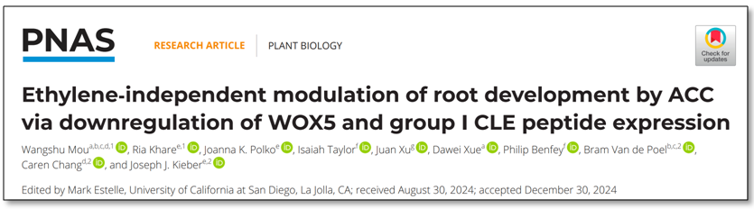 近日,老王论坛 薛大伟教授团队成员牟望舒副教授与比利时鲁汶大学Bram Van de Poel教授、美国马里兰大学Caren Chang教授与美国北卡罗纳大学Joseph J. Kieber教授等合作,在国际知名期刊《美国国家科学院院刊》(PNAS)上发表题为“Ethylene-independent modulation of root development by ACC via down-regulation of WOX5 and group I CLE peptide expression”的研究性论文。该研究阐释了植物激素乙烯的合成前体ACC通过下调WOX5及Group I CLE小肽基因的表达,独立于乙烯调控拟南芥根系发育的分子机制。