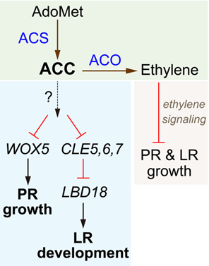 另一方面,与乙烯抑制侧根形成的作用相反,ACC能够正调控侧根发育并加速侧根原基的突破。进一步研究表明,ACC可能通过抑制 CLE小肽家族中Group I成员的表达,激活其下游转录因子LBD18,从而促进侧根发育。