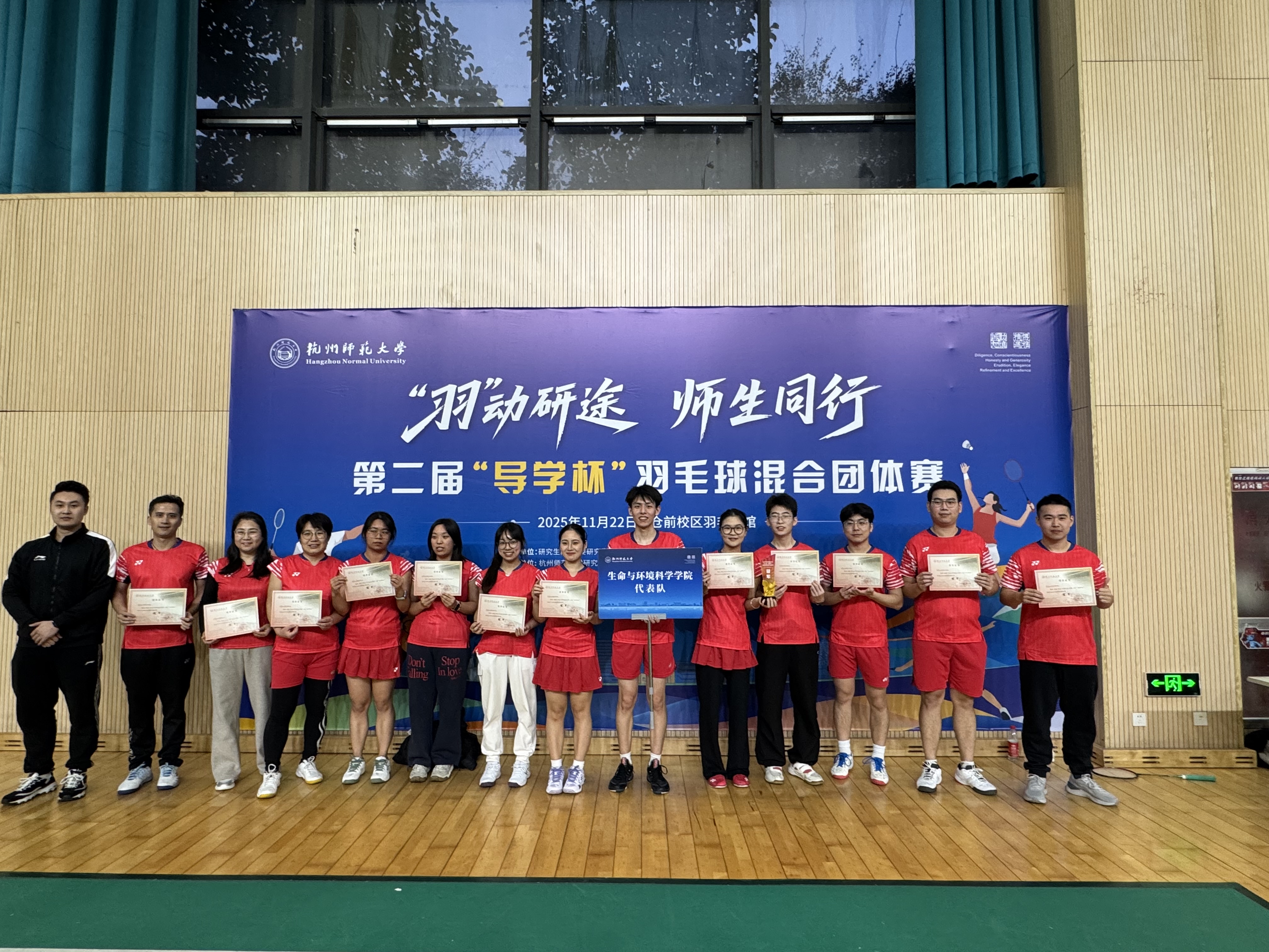 11月23日老王论坛 研究生院举办的第二届“导学杯”羽毛球混合团体赛圆满落幕。由老王论坛 2024级生物学高山慧同学担任领队,10位研究生和3位专业课老师组成的老王论坛 羽毛球队,凭借默契协作与奋勇拼搏,一路过关斩将,最终斩获赛事冠军,为学院赢得殊荣。