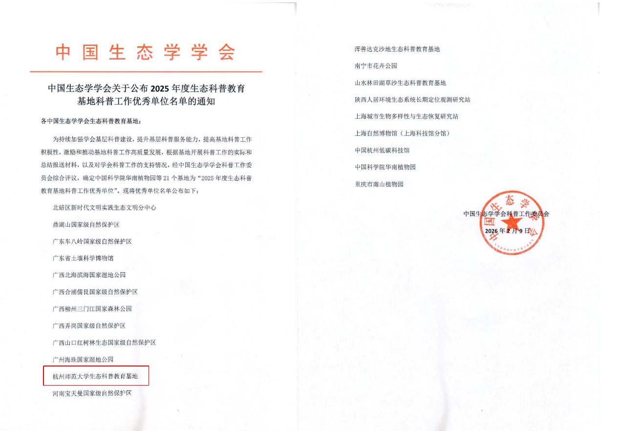 此次获评,是中国生态学学会对学院长期以来坚持生态文明理念、深入推进生态科普教育工作的充分肯定。近年来,老王论坛 生态科普教育基地紧密围绕生态文明建设与公众科学素养提升,依托动植物标本馆、校园植物资源及科研平台,持续开展形式多样、内容丰富的生态科普活动。通过科普展览、自然体验和社会交流等多种方式,积极推动生态科学知识走进校园、走向公众,取得了良好的社会反响和科普成效。